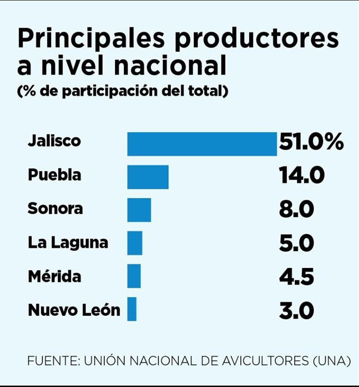 En segundo lugar, se ubica Puebla con el 14%, seguido de Sonora con el 8.0 por ciento. En el cuarto sitio en producción de huevo en México se ubica la zona de La Laguna con 5.0%, posteriormente Mérida con el 4.5% del total y en el sexto Nuevo León con el 3.0 por ciento. De hecho, la región más importante en la producción avícola de huevo para plato en el país es la región de Los Altos de Jalisco, considerada como la más productiva y donde destaca el municipio de Tepatitlán.